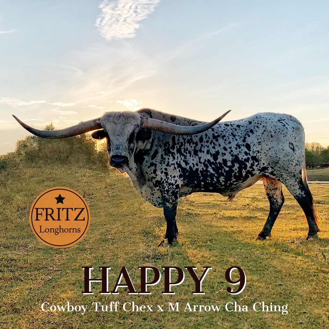 Happy 9 is the product of Cowboy Tuff Chex, the world record longest tip-to-tip bull, and M Arrow Cha-Ching, the industry's longest total horn cow. Not only will Happy pass along great horn, but he's also proven his ability to pass along color, size, and conformation. Conventional semen available at $150/straw. Stored at Champion Genetics and Hoofstock.