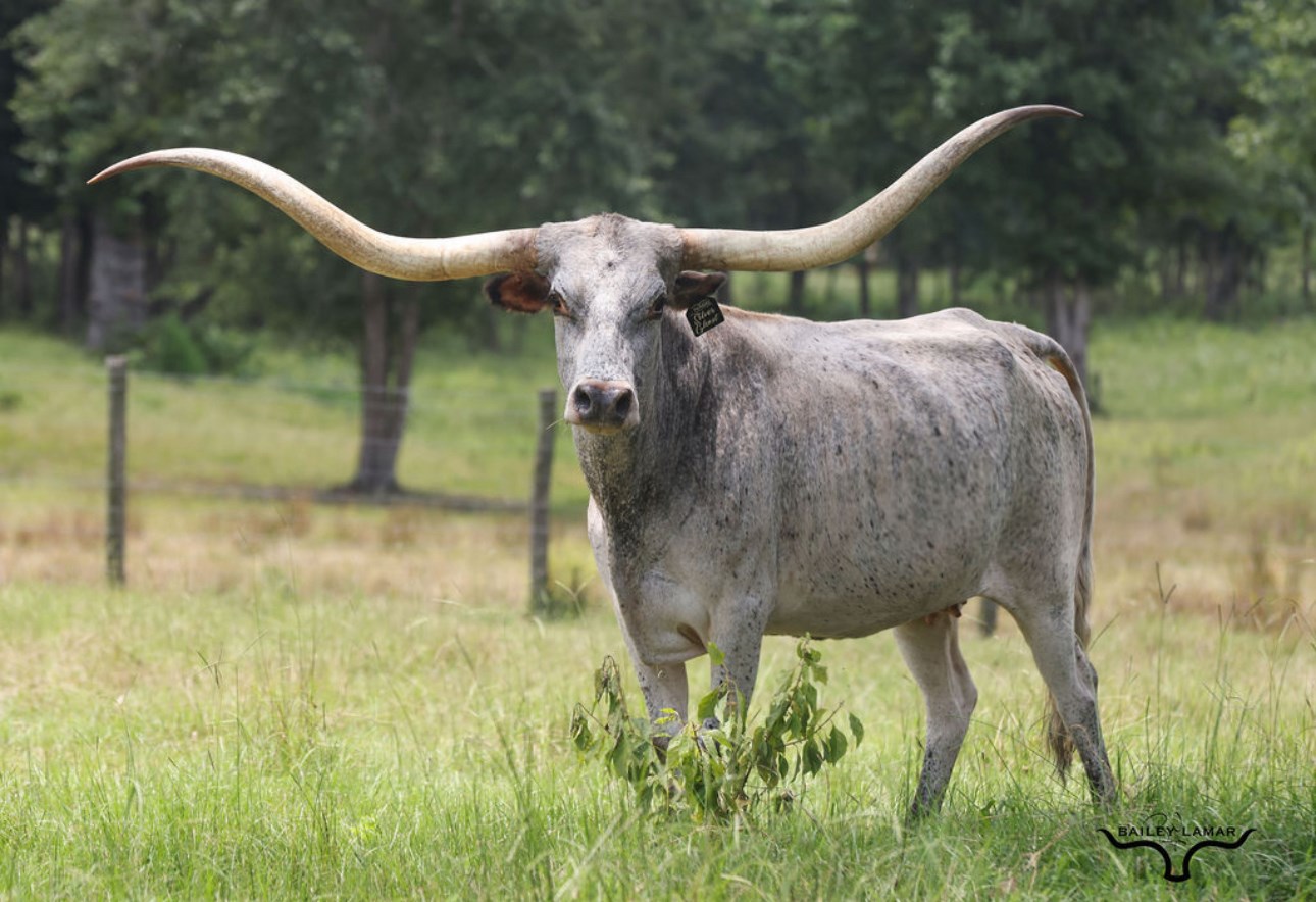 Really nice cow raised by Silver T Longhorns. Her sire is great Happy 9 Bull (Cowboy Tuff Chex x M Arrow Cha Ching) both Guinness Book record holders. She is confirmed bred to Heart Breaker the 90" T2T full brother of Happy 9. Not to mention, she is already in the pasture with RJF Lock & Load, the full brother to Happy 9 and Heart Breaker. This should make for an interesting story.....