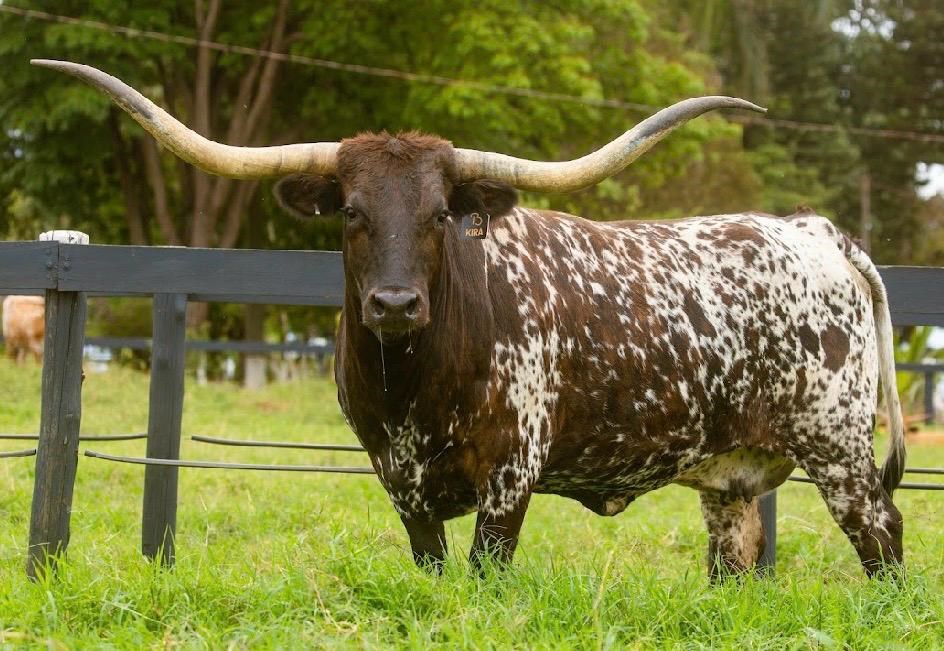 Flashy colored Parker brown cow, big bodied cow with black horns. Expedite daughter with a pedigree that includes Cowboy Catchit Chex, double bred Cowboy Chex, Horseshoe J Innovate and BL Kendall Tuff. Kira has been an excellent mother and milker with a docile personality in the herd. Sheβs produced a flashy colored big bodied heifer and is currently bred to award winning 20 Gauge.
